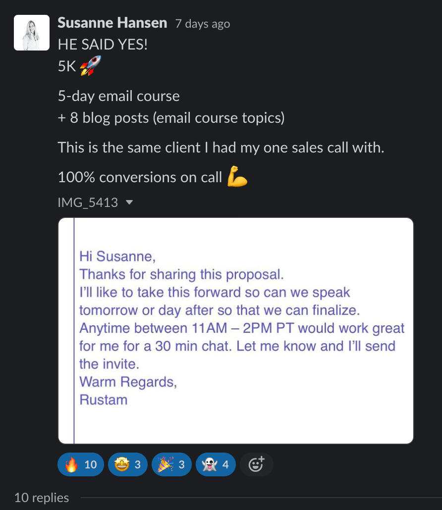 Even if you’ve never ghostwritten anything before, we can get you up to speed!Susanne is a terrific case study in just how quickly a brand new ghostwriter can start closing high-ticket clients.When she joined the Premium GhostwritingAcademy, Susanne had never worked as a ghostwriter before, but was excited to get up to speed on writing, packaging, and selling Educational Email Courses (EECs).Although it took her ~30 days to nail down her niche, as soon as it clicked, she landed her first high-ticket client almost immediately.