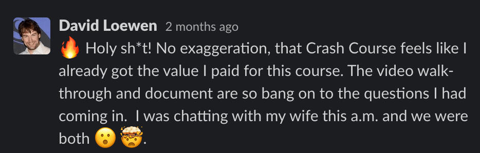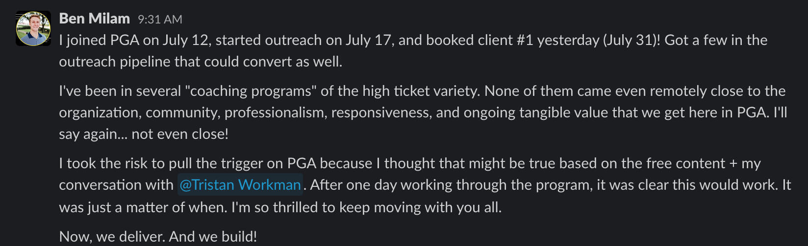 Ben's story was pretty similar.Before joining our Premium Ghostwriting Academy, he had been working as a freelance copywriter for a little over 3 years, offering all sorts of copywriting services.But as soon as he started working through our curriculum, he immediately realized the power of niching down and having a differentiated offer.So he flew through our modules—and in less than 3 weeks, he landed his first Educational Email Course client. Talk about speed!