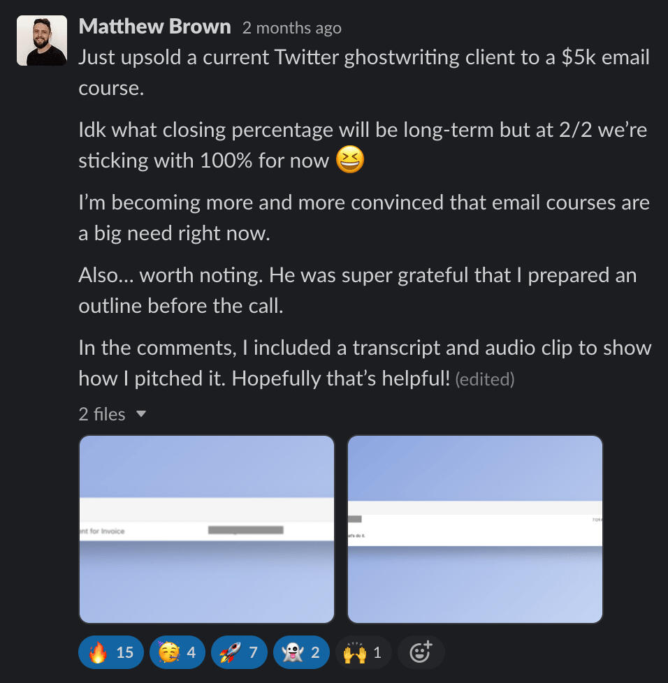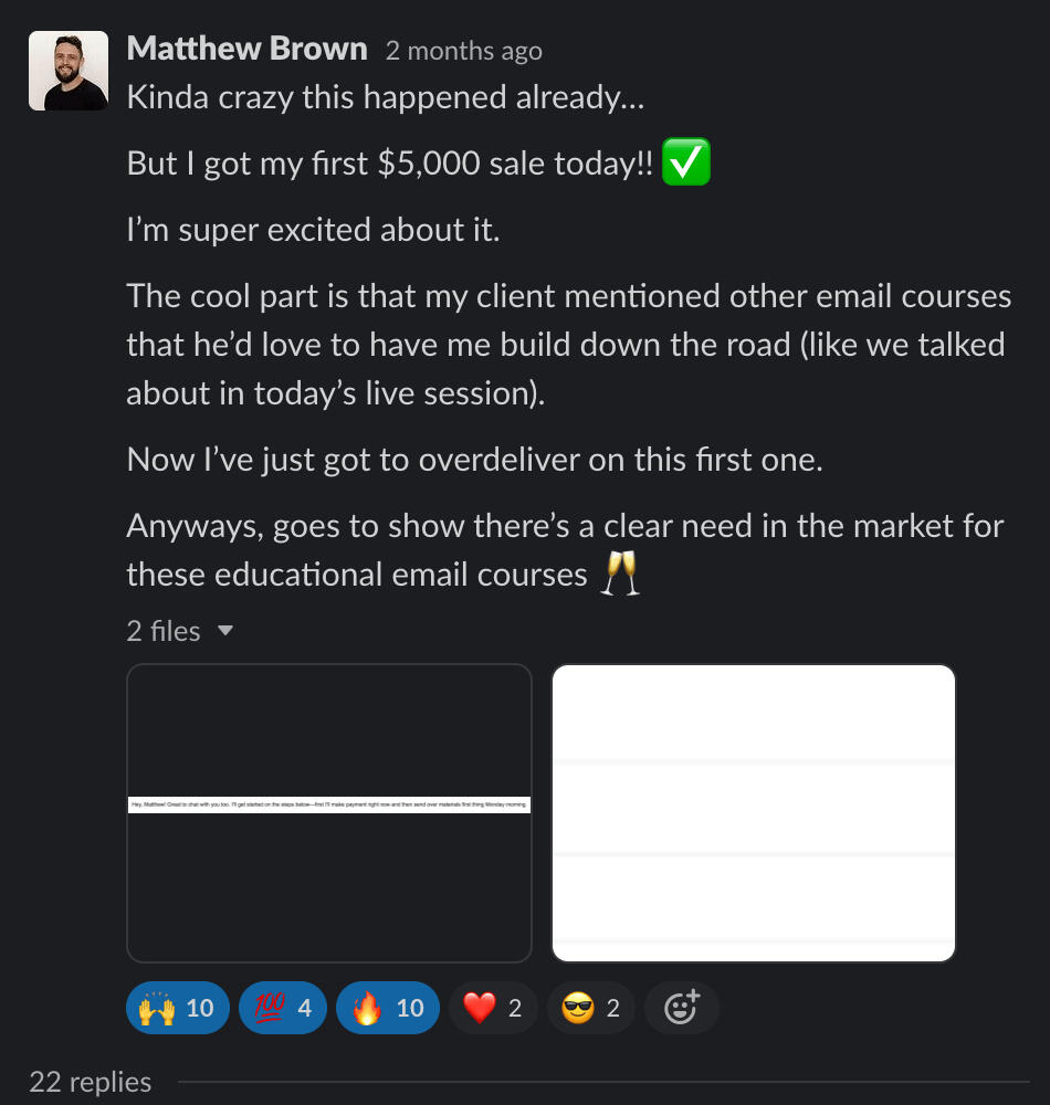 Are you a freelancer tired of churning out blog posts for minimum wage?We aren’t just going to show you how to scale yourself as a ghostwriter. We’re also going to train you on a completely differentiated offer: ghostwriting 5-Day Educational Email Courses!Matthew Brown could hardly believe how fast this happened. He is a Twitter ghostwriter and ended up selling his first $5,000 Educational Email Course… in the very first week.